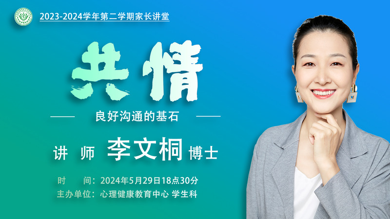5月29日晚上6:30,心理健康教育中心邀请临床医学博士、华东师范大学心理与认知学院博士后、副主任医师李文桐,在线上开展了家长讲座“共情:良好沟通的基石”,共304名学生家长参加。