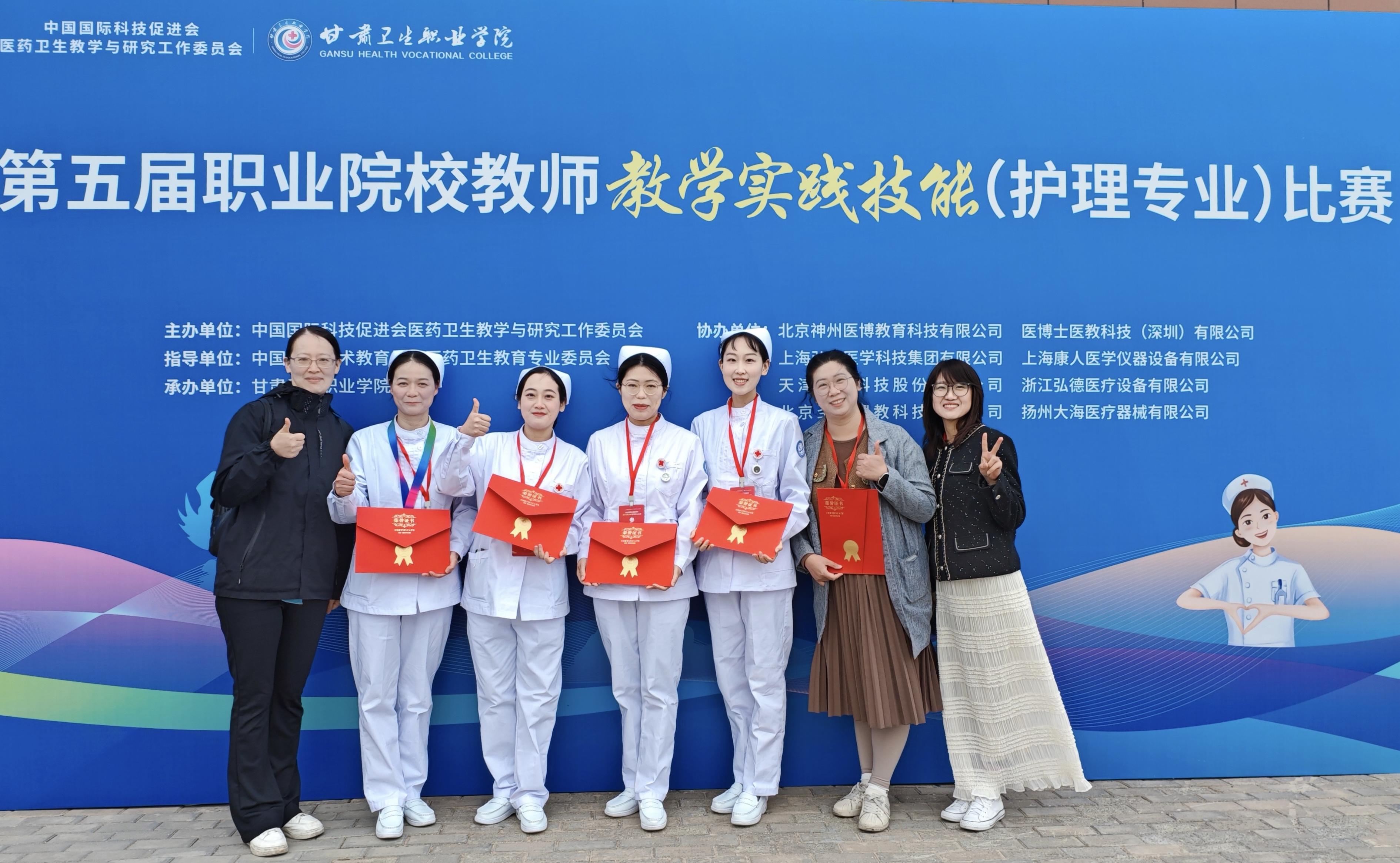 4月23日-4月27日,第五届全国职业院校教师教学实践技能(护理专业)比赛在甘肃卫生职业学院成功举办。大赛吸引了来自全国62所中、高职院校的217名参赛教师同台竞技,展开激烈角逐。我校护理系教师组成的参赛团队(选手:沈蓓蓓、徐清风、潘美伯、陈慧勤;标准化病人:鞠晓红)凭借扎实的专业功底和出色的现场表现,从众多参赛队伍中脱颖而出,斩获说课程单项一等奖(沈蓓蓓)、三等奖(徐清风),技能单项三等奖及团体三等奖四个奖项。
