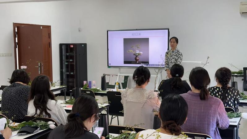 随后,专业老师对插花技巧进行详细讲解,从花枝挑选、色彩搭配到意境营造,全方位展示了“人文插花”与“禅意插花”等传统风格的特点与技法。与西式插花的繁复艳丽不同,中式插花注重“留白”与“意境”,一枝梅、一束竹、几片叶便能勾画出“虽由人作,宛自天开”的东方美学意境,展现了中式插花独特的魅力所在。