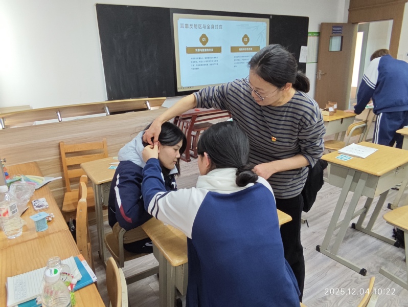 活动现场,志愿者们通过生动的讲解与示范,依次介绍了耳穴埋籽、艾灸、八段锦三项中医传统疗法。在耳穴埋籽环节,教师们引导学生亲手将王不留行籽贴于耳部相应穴位,感受这一古老疗法的独特魅力;艾灸体验中,学生们在教师指导下学习温灸手法,体会传统灸法的温通之效。活动尾声,全体参与者共同练习中医导引术八段锦,中外师生跟随节奏舒展肢体,感受传统养生功法的韵律与内涵。整套动作流畅自然,既展现了中医文化的深厚底蕴,也体现了中外文化交流的和谐氛围。