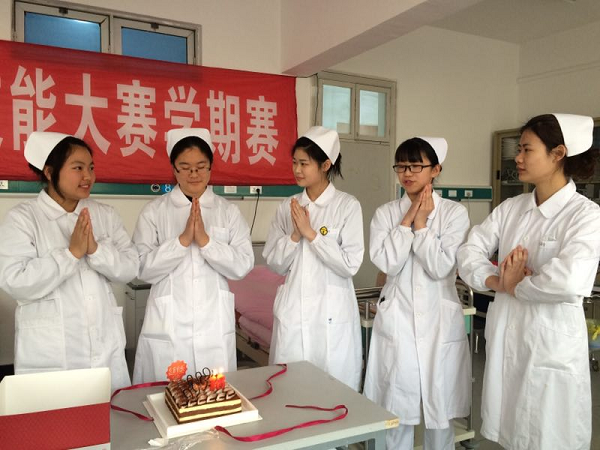 起初,由于大赛与“三校生”高考考试时间冲突,学生一度情绪化,使大赛准备工作处于消极状态,这些躲不过我们专业学科组德高望重的周霞辉老师的观察,通过学生科、班主任、学科组张月英、张锋等老师的耐心劝导和梳理,同学们逐渐进入状态。3月5日,细心的周老师得知这天是14护1班蒋玉婷同学18周岁的生日,特地为她订做了一盒蛋糕,使学生颇为感动,正由于这种感动,使学生全身心投入备战状态。