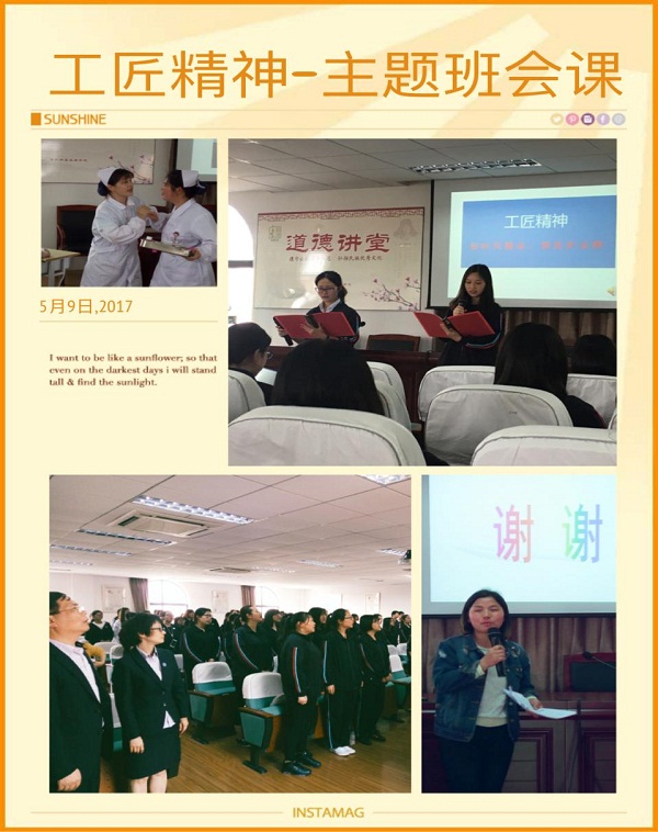 从“寻找一颗永不松动的螺母”开篇,到全体学生宣誓结尾,整节班会课逻辑清晰,内容丰富,形式多样,设计完整。从介绍“工匠精神”的内涵、时代背景,到展示当下最具代表性的体现工匠精神的成功企业和典型人物,通过同学们的生动主持和精心设计,短短40分钟,大家不仅聆听了“华为”的故事,分享了医护名家林巧稚与蔡蕴敏的励志事迹,还看到了同学们结合自己的护生身份,对所经历的课堂学习、生活与将要面临的临床实习所做的思考。