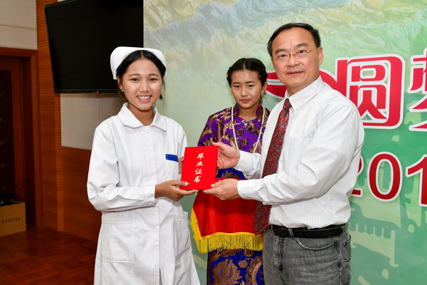 黄钢校长为每一位毕业生颁发毕业证书,并代表学校党政向顺利完成学业的31名西藏班同学表示热烈祝贺,向一直兢兢业业、耕耘奉献的老师们表示崇高的敬意。他指出三年来,同学们伴随着学校一起成长,校园里留下了同学们勤学上进的身影,留下了难以割舍的情怀,也收获了知识,锻炼了能力, 希望她们带着学校的厚望返回家乡,为家乡医疗水平的提高贡献自己的力量。