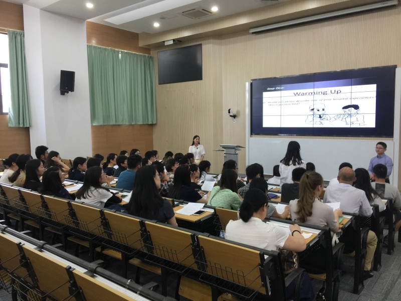 6月15日,外语教学部全体教师在南苑沉浸式教室W100举行全体教研活动,本次活动主要观摩由孙芳、王宗忠两位青年党员骨干教师开设的医学人文特色课程“Medical Story”公开课,该门 课程是我校大学英语教改项目的拓展课程,旨在培养医学生的医学人文素养,通过医患共情,换 位思考,构建医学生对于患者的耐心和同情心,共建和谐的医患关系。经过精心的课程设计和有 效的课堂组织,两位教师展示了如何在学习英语和应用英语语言的过程中,通过各种创新的形式 培养医学生的人文素养,激发医学生的人文情怀。