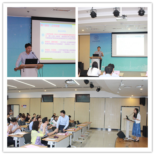 姜冠成详细介绍了上海市语委开展高校语言文字工作的背景、意义和要求,从依据目的、基本流程、现场阶段和相关材料四个方面介绍了评估的基本要求。姜冠成指出,推广普通话、推行规范汉字,开展语言文字的规范化管理,是贯彻落实《中华人民共和国国家通用语言文字法》和依法管理的一项重要措施。语言文字工作是高等学校承担的职责和使命,要深刻理解语言文字工作作为文化载体在学校文化建设中起着基础性的作用,深刻理解做好学校语言文字工作对增强学校内涵发展,为社会培养具有创新意识的高素质人才的重要意义。市语委对我校前期的准备工作予以充分的肯定,希望大家遵循“以评促建、以评促改、以评促优”的评估方针,进一步提高学校语言文字的规范化水平。