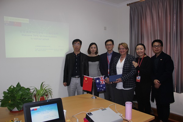 2017年11月10日,南澳大利亚职业技术学院社区服务,健康与生活方式学院代理院长Susan Hopkins,院长助理及国际合作专员葛延飞一行二人到访上海健康医学院附属卫生学校。校长汤磊、教务科长王智礼、综合办主任臧圆圆、口腔药学系主任金燕婷及系部专业老师热情接待,并就中澳双方合作意向进行了研讨。
