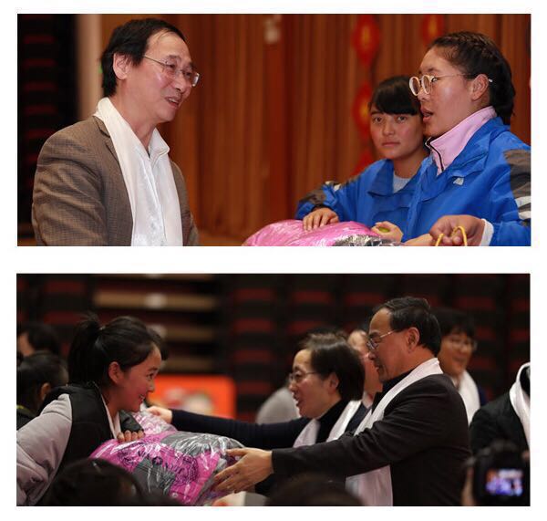 最后,各领导和嘉宾为在场的所用同学送上了慰问大礼包和衣服,此次座谈会在欢乐的全场锅庄舞中圆满结束。2018年已经到来,西藏学生教育管理工作任重而道远,学校将继续紧抓藏族学生工作,继续探索方式方法,使藏族学生工作锦上添花,更上一层!(学生科)