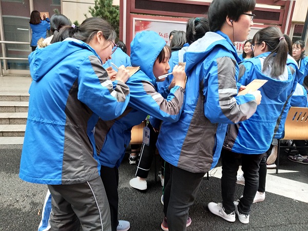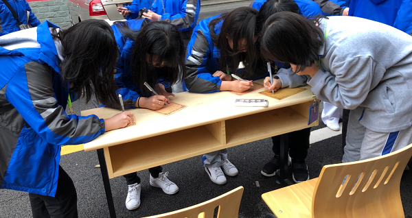 虽然早春三月的天气依然寒冷,但闻讯而来的同学们热情高涨,积极参与,思考着该如何下笔给未来的自己或同学写信,由于场地关系,桌椅有限,很多学生或坐在台阶上,或站着依靠着同学的背,认真写信,每一封信都承载着同学们对未来的憧憬和对朋友的珍惜之情。