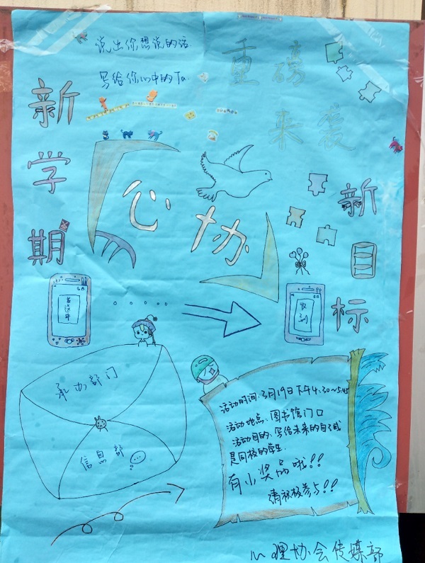 2018年3月19日,经过前期精心地筹划和准备,在徐汇校区图书馆门口,上海健康医学院附属卫生学校心理协会主办了“新学期,新目标——写给未来的一封信”主题活动,可以选择给未来的自己或同学写一封信,并且指定想要收信的日期,信由心理协会暂时保管,临近指定日期再寄信给指定收信人。