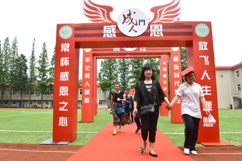 仪式前,在老师们的注目和家长的陪伴下,同学们手持献花依次步入成人门,由校领导亲自为其授予成人帽,十八岁的步伐,自信坚定,意气风发。