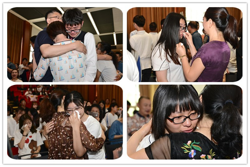仪式在全场齐唱国歌中开始,之后进入全场最为感人的环节,学生和家长在动情短片下借此机会进行了难得的亲密互动,学生饱含深情地注视着自己的父母,与父母紧紧相拥,学生和父母的眼眶早已被眼泪润湿,展现了十八年来与父母之间的点滴成长和感动,全场所有人都感慨万千。