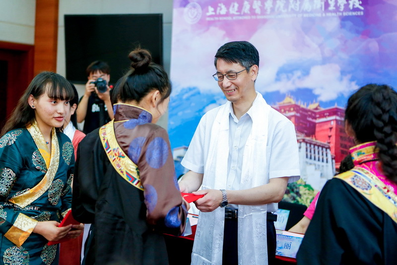 许铁峰副校长为毕业代表生颁发毕业证书,并代表学校向顺利完成学业的70名西藏班同学表示热烈祝贺,向一直兢兢业业、辛勤教诲的老师们表示崇高的敬意。他指出,三年来,同学们伴随着学校一起成长和进步,在母校校园里留下了同学们勤学上进的身影,留下了难以割舍的情怀,也收获了知识,锻炼了能力,希望她们带着学校的厚望返回家乡,为家乡医疗水平的提高贡献自己的力量,做一个对社会有用的人。