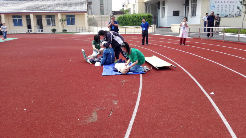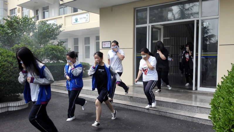 下午2:30,二号教学楼底楼突然浓烟冒起,随即整个校园警报响起,警报即命令,师生们快速有序跑出教学楼,撤离到操场,在不到2分钟的时间内,全校师生迅速而有序的完成了疏散演练。随后,现场进行了急救包扎和心肺复苏操作展示。