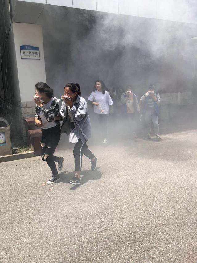 中午12:30,副校长刘宏正宣布2018年消防逃生灭火演习开始。第一教学楼有烟雾冒出,保安发现火情,马上发出指令,校义务消防队员接到报警后火速赶到现场引导同学们手捂毛巾,压低身姿进行疏散,使学生撤离到安全地点。为了能使师生们更加好地掌握消防灭火技能,校义务消防员进行水带、水枪表演,最后在场人员进行灭火演练。