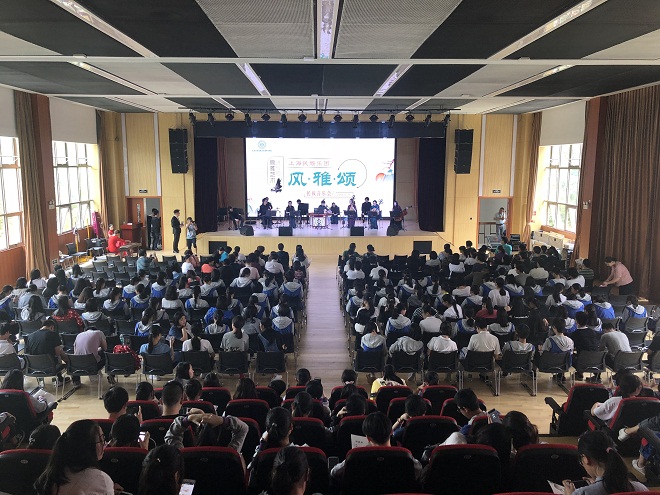 6月15日下午12:30,本学期高雅艺术进校园首场演出《风雅颂》民乐经典音乐会在我校大礼堂拉开帷幕。此次活动旨在弘扬民族文化,传承民族精神,更好地将民族瑰宝展现给全校师生,给师生们带来了一场高雅音乐会。由上海民族乐团携“风.雅.颂”而来,奏起民乐之声的缠绵悱恻与激情澎湃。全校教职工和17级全体学生共同欣赏了整场音乐会。