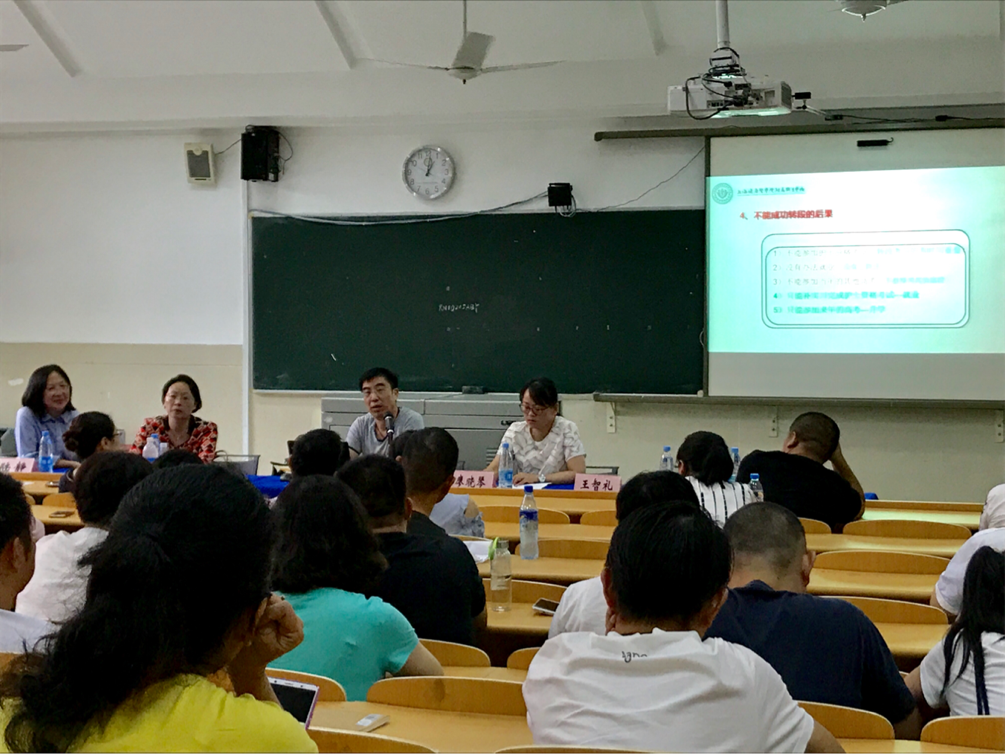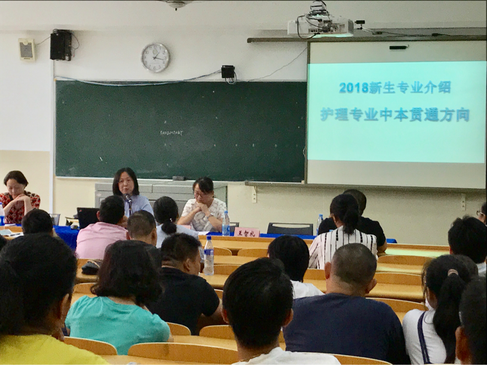 我校教务处处长王智礼首先介绍了教委对于中本贯通护理专业的政策解读。其次介绍了2015-2018年招生学生基本情况;中职学校与高等学校的办学基本情况;贯通培养相关上位文件精神以及人才培养特点;贯通专业培养目标、课程设置及教学安排等;贯通培养的甄别、转段、学籍管理、学业评价等相关规定。最后提出了对于护理学生的希望与要求。