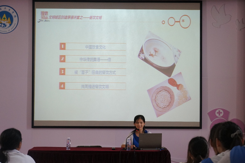 9月21日,我们很荣幸地邀请到了金山区“厚德讲堂”的讲师团成员——金山区精神卫生中心的张宴萍主治医师为我们讲课,她带来的是第一讲——餐饮文明。